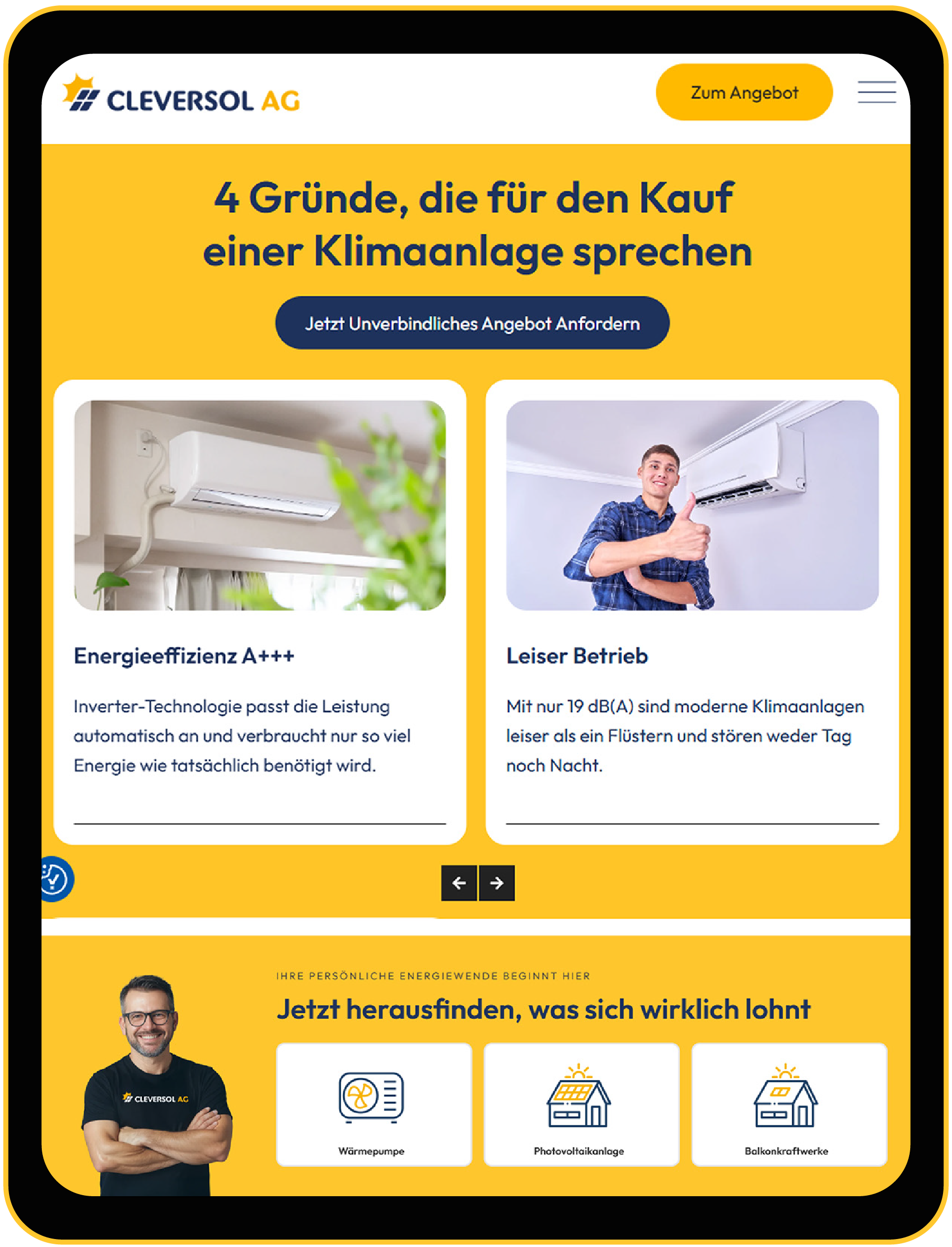 „CleverSol“ teikia novatoriškas paslaugas atsinaujinančiosios energijos srityje, įskaitant fotovoltines sistemas, šilumos siurblius, klimato kontrolės sprendimus ir energijos kaupimo sistemas. Svetainė sukurta siekiant aiškiai pristatyti įmonės paslaugas, padidinti potencialių klientų skaičių ir sukurti modernų skaitmeninį įvaizdį gyvenamųjų namų ir verslo klientams.